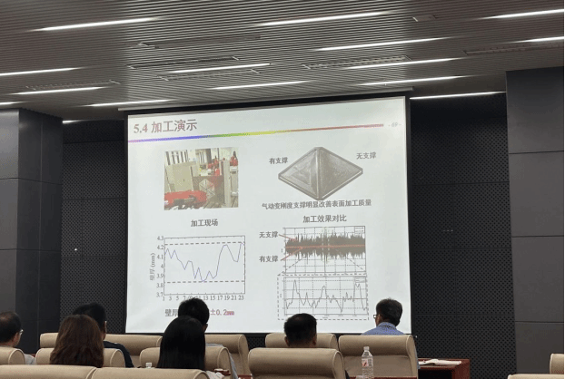 林彬重点介绍了弱刚性薄壁构件的近恒刚度加工及其误差自适应补偿的相互研究内容,从课题背景出发介绍了运载火箭燃料贮箱薄壁加工的传统方法及缺点,从运载火箭燃料贮箱薄壁加工的传统方法及刚性不足、变形显著等缺点切入,系统阐述了基于镜像铣削的切削颤振研究、面向镜像高效加工的刀具结构优化、面向镜像铣的多点自适应支撑结构设计、薄壁件格栅加工策略及路径规划,以及五自由度混联装备创新及集成控制研究等核心内容,为师生拓宽了眼界。