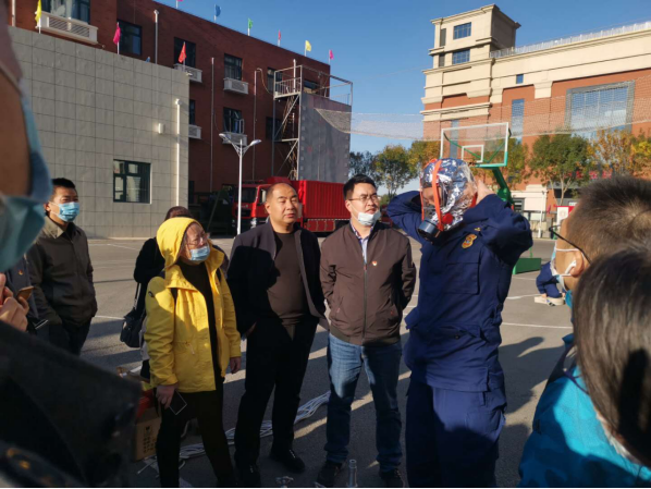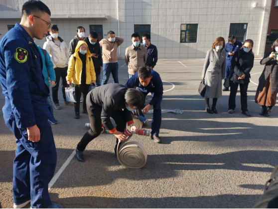 教师们还在消防员的带领下进行现场演练,了解消防车内部的各种消防用品,学习了如何打逃生绳结,学习如何使用消防水带和防毒面具。