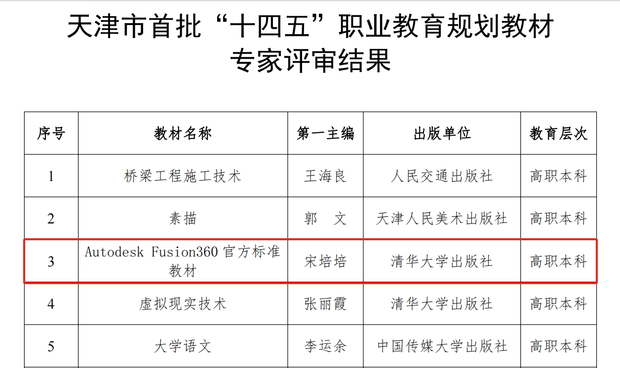 教师宋培培编著的《Autodesk Fusion360官方标准教材》入选天津市首批“十四五”职业教育规划教材。